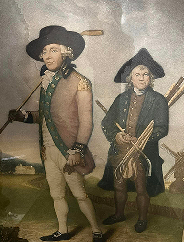 William Innes (1760-1803) was a captain of the Society of Golfers at Blackheath and is shown here on the course with his caddy. This print was originally issued in black and white in 1790 and later hand-colored. Several later printings exist.