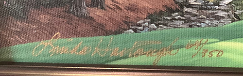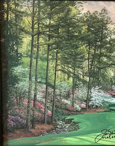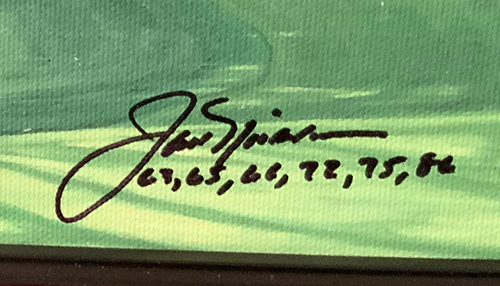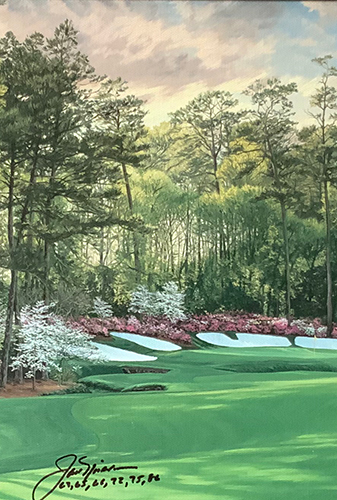 This limited edition giclee, #65/350, by famous golf landscape artist Linda Hartough has been signed by the artist, as well as Jack Nicklaus who has listed the years he won his six Masters Championships.