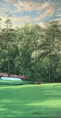 The 13th Hole, a majestic par five that is probably the most famous hole on the golf course, was designed by Alistair MacKenzie at almost the moment he first laid eyes on the property. At the lowest point of the property, it parallels the path of Rae's Creek, winding around a right-to-left corner 465 yards to where the creek crosses in front of the large green. This was the first golf scene painted by Linda Hartough and started her career as a golf landscape artist.