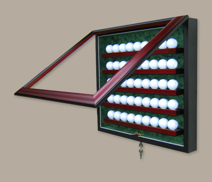 What a beautiful way to display your golf ball collection! Not only beautiful but with UV protective glass this will protect your collection for generations to come. Featuring a mahogany door and green suede mat what a lovely way to showcase your collection.