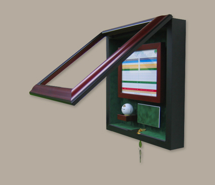 Display your scorecard and ball from your magical hole-in-one! Protective UV glass as well as mahogany door and green suede mat make this a handsome way to display your achievement. Most scorecards fold to 4" x 6". Please advise if your scorecard size is different. Laser engraved plate provided. Please call 800-449-4097 to provide copy.