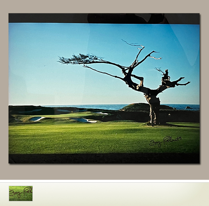 This beautiful and vibrant unframed image of #16 at Cypress Point was shot by premier landscape photographer Tony Roberts and he has autographed the image.