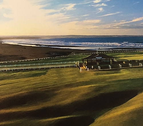 This panoramic is one of most popular images of the historic Old Course at St Andrews. The R & A Club House is shown on the right, bathed in golden light.