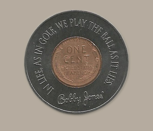 This stunning ball marker commemorates Bobby Jones’ 1930 Impregnable Quadrilateral with an original 1930 wheat penny, which has been surrounded by a zinc alloy edging with Bobby Jones famous quote on one side and the 4 events comprising the Impregnable Quadrilateral on the flip side. Each ball marker measures 1.5" and comes in a protective, drawstring pouch.