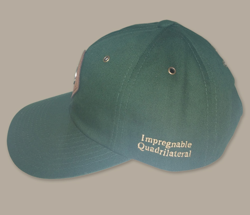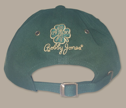 Commemorating Bobby Jones Impregnable Quadrilateral this 100% cotton cap has a genuine 1930 Buffalo Nickel, soft fabric strap, "Impregnable Quadrilateral" and Bobby Jones signature and four leaf clover (which represents Bobby Jones birth date on St. Patrick's Day in 1902) in customized embroidery on the side and back of the cap.