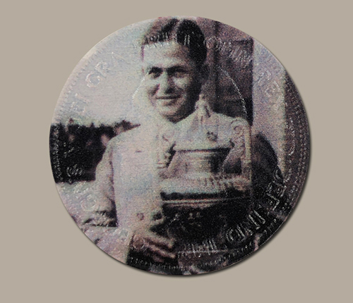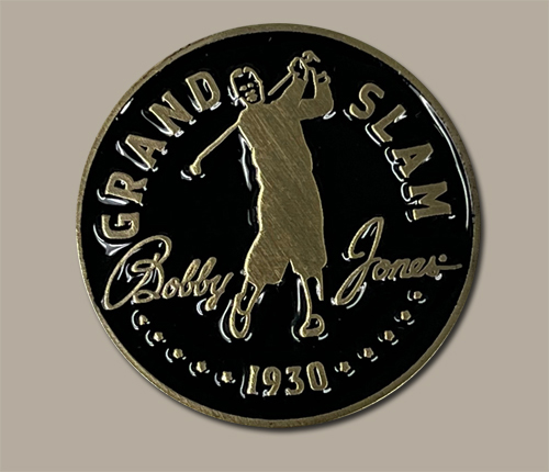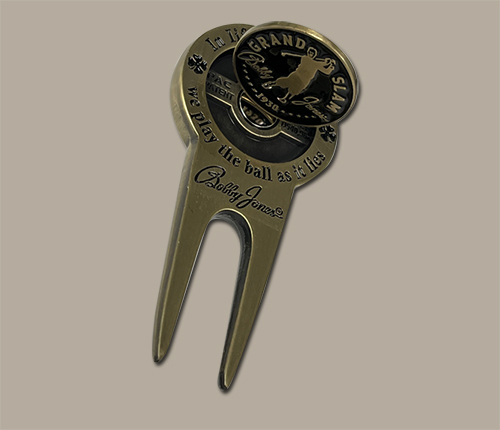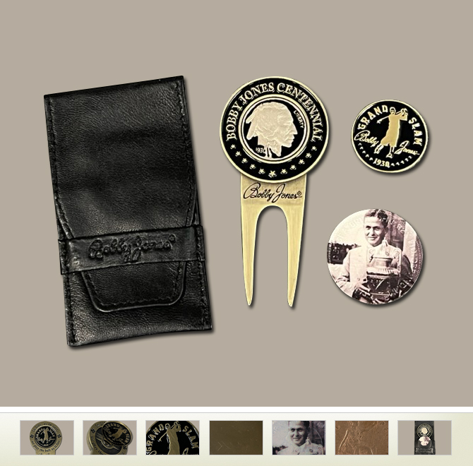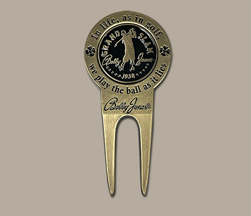 This handsome brass toned metal repair tool and ball marker commemorates Bobby Jones’ 1930 Impregnable Quadrilateral with a 1930 Buffalo Nickel on the front side of the repair tool. Imprinted around the rim of the front side is "Bobby Jones Centennial". Imprinted on the back is Jones famous quote, “In life, as in golf, we play the ball as it lies.", separated by a shamrock - Jones was born on St. Patrick's day - March 17, 1902 and always carried a shamrock charm on his pocket watch chain This divot repair tool has a ball marker on the back that is magnetic and features an image of Bobby Jones. Also included is a ball marker printed on a 1930 British bronze penny coin. Bobby Jones is shown holding the British Amateur trophy at The Old Course in St Andrews in what was to become the first leg of The Grand Slam which saw Jones capturing all four major golf tournaments in the same year. All are handsomely kept in a lambskin wallet embossed with "Bobby Jones".