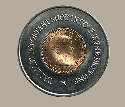 This commemorative ball marker contains a 1953 farthing which was the year Queen Elizabeth II ascended the throne after the death of her father, King George VI. On the flip side of the ball marker we have one of our favorite Hogan quotes: "The most important shot in golf is the next one"