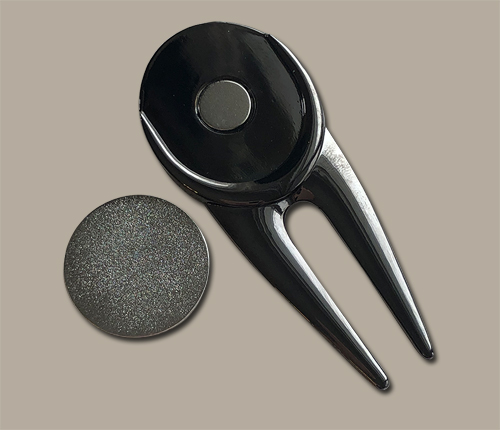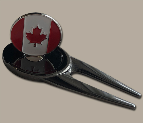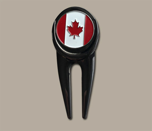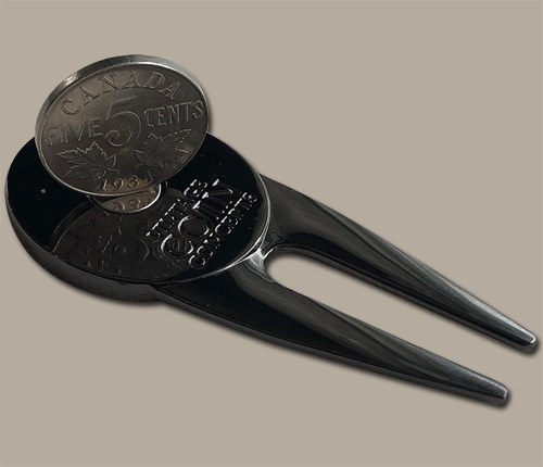 This unique metal divot repair tool with a black nickel finish has a magnet on both sides to hold a Canadian themed ball marker on one side and a genuine pre-1937 Canadian nickel on the other. Most coins are not magnetic, however, coins made of nickel or steel are magnetic. Canadian nickels are made of real nickel whereas American “nickels” are only 25% nickel. The Canadian nickels are magnetic, but U.S. nickels are not.