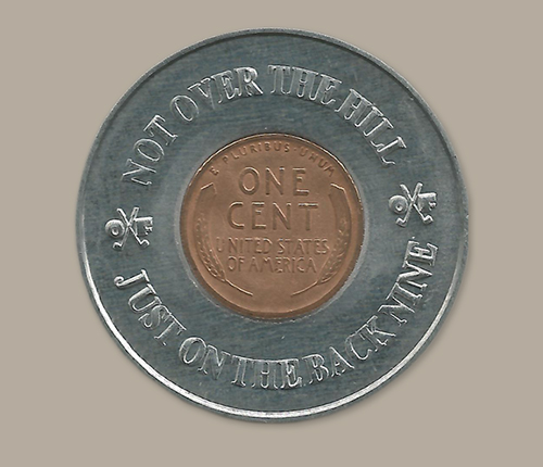 A unique and fun way to celebrate the year your golfer was born and gift them with a ball marker they'll use and enjoy! Each ball marker contains a genuine penny from their birth year and is encased in a zinc ring proclaiming them members of the "Ye Old Farts Golfing Society". And as the flip side reminds us "Not over the Hill, Just on the Back Nine".