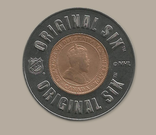 This stunning ball marker commemorates the Montreal Canadiens birth date with an original 1909 Canadian penny and is encased in steel inscribed with the team's name and on the flip side with "Original Six" and the official NHL logo . Each ball marker measures 1 13/16" and comes in a protective, drawstring pouch.