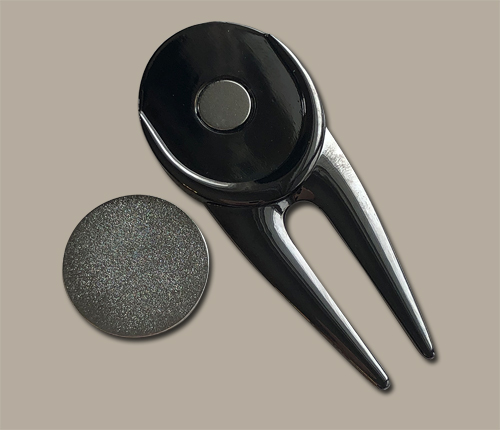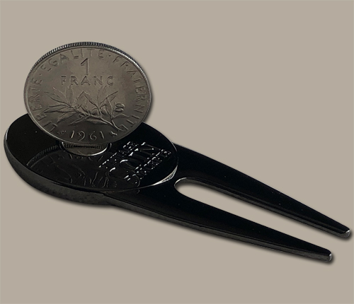 This unique metal divot repair tool with a black nickel finish has a magnet on both sides to hold a France themed ball marker on one side and a genuine French 1 franc on the other. Most coins are not magnetic, however, coins made of nickel or steel are magnetic. These 1 franc coins are nickel and are magnetic. The diameter is about the same as a U.S. quarter.