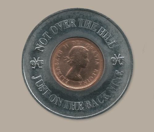 A unique and fun way to celebrate the year your golfer was born and gift them with a ball marker they'll use and enjoy! Each ball marker contains a genuine Canadian penny from their birth year and is encased in a steel ring proclaiming them members of the "Ye Old Farts Golfing Society". And as the flip side reminds us "Not over the Hill, Just on the Back Nine".