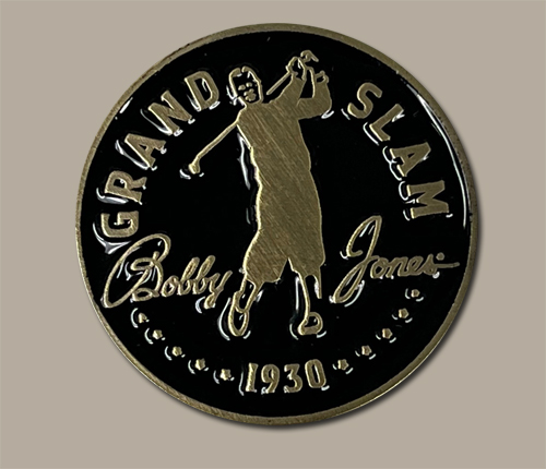 This handsome brass toned metal repair tool and ball marker commemorates Bobby Jones’ 1930 Impregnable Quadrilateral with a 1930 Buffalo Nickel on the front side of the repair tool. Imprinted around the rim of the front side is "Bobby Jones Centennial". Imprinted on the back is Jones famous quote, “In life, as in golf, we play the ball as it lies.", separated by a shamrock - Jones was born on St. Patrick's day - March 17, 1902 and always carried a shamrock charm on his pocket watch chain This divot repair tool has a ball marker on the back that is magnetic and features an image of Bobby Jones.