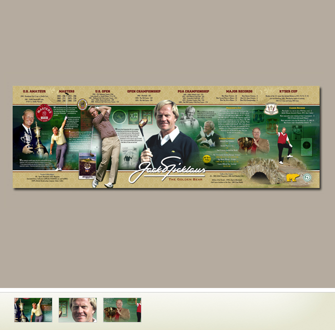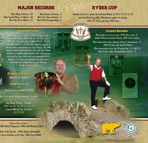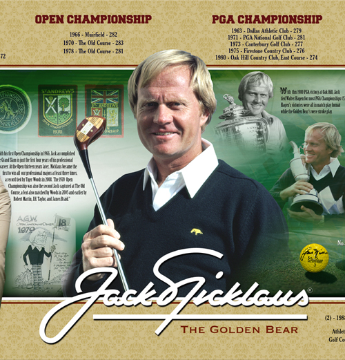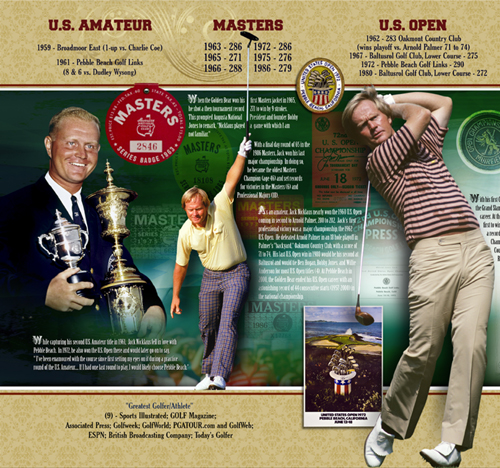 This handsome presentation illustrates the legendary career of Jack Nicklaus beginning with his first U.S. Amateur Championship title in 1959. Listing all his major championships, dates, locations, winning scores and complemented with photos, interesting facts, and statistics spanning his singular career -- a must have for Mr. Nicklaus' fans and lovers of golf history!
