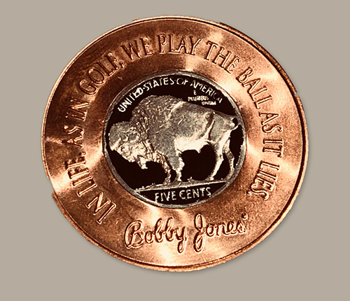 This stunning ball marker commemorates Bobby Jones’ 1930 Impregnable Quadrilateral with a 1930, hand enameled, Buffalo Nickel, which has been surrounded by a solid copper edging with Bobby Jones famous quote on one side and the 4 events comprising the Impregnable Quadrilateral on the flip side. Each ball marker measures 1.5" and comes in a protective, drawstring pouch.